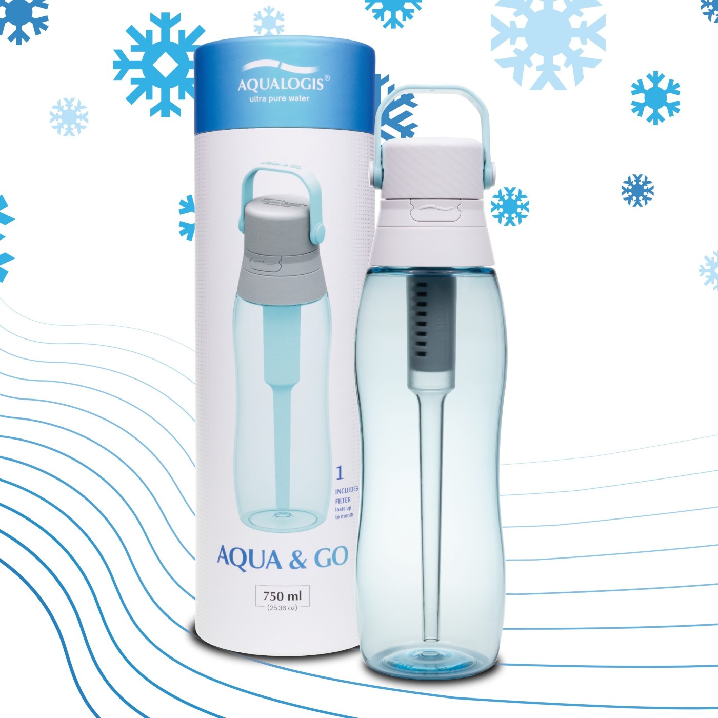 Butelka z filtrem Aqua&Go 750 ml w kolorze niebieskim marki Aqualogis to wygodne i ekologiczne rozwiązanie do codziennego nawadniania.